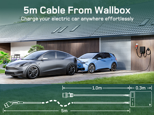 LCD zaslon prikazuje podatke v realnem času: moč, tok, napetost in kapaciteto polnjenja, kar zagotavlja jasen pregled nad delovanjem. 7,5 metra dolg kabel omogoča udobno polnjenje vozila v garaži ali na dovozu.