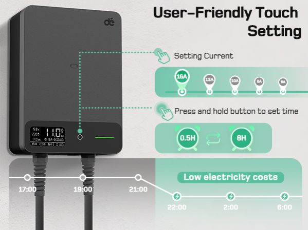 LCD zaslon prikazuje podatke v realnem času: moč, tok, napetost in kapaciteto polnjenja, kar zagotavlja jasen pregled nad delovanjem. 6 metrov dolg kabel omogoča udobno polnjenje vozila v garaži ali na dovozu.
